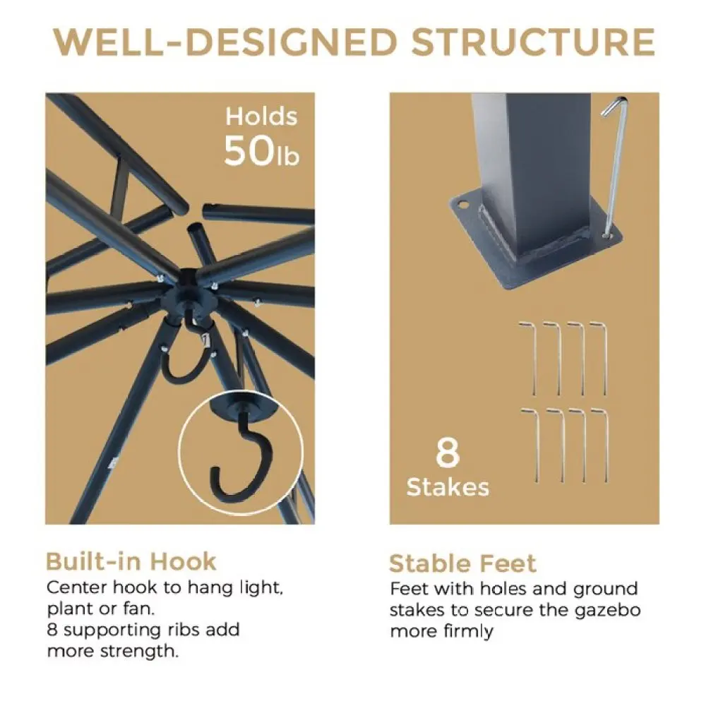 【Premium Galvanized Steel Construction】: Our gazebo boasts a sturdy and lightweight design with its Galvanized Steel column and Galvanized Steel beam, ensuring durability while remaining rust-proof. The roof is double top vented for optimum airflow and comfort during periods of strong wind. The middle of roof has two hooks that can be hung with electric lights or fans