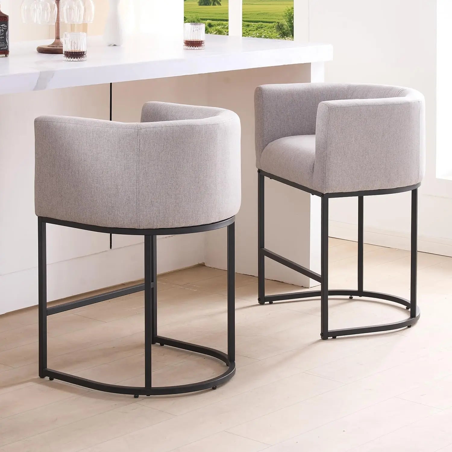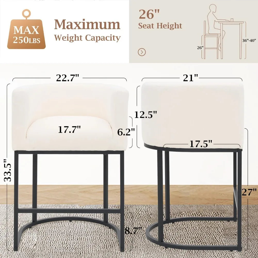 26" H Counter Height Bar Stools Modern Barrel Counter Stools with Backrest and Arms, Black Metal Frames,Fabric