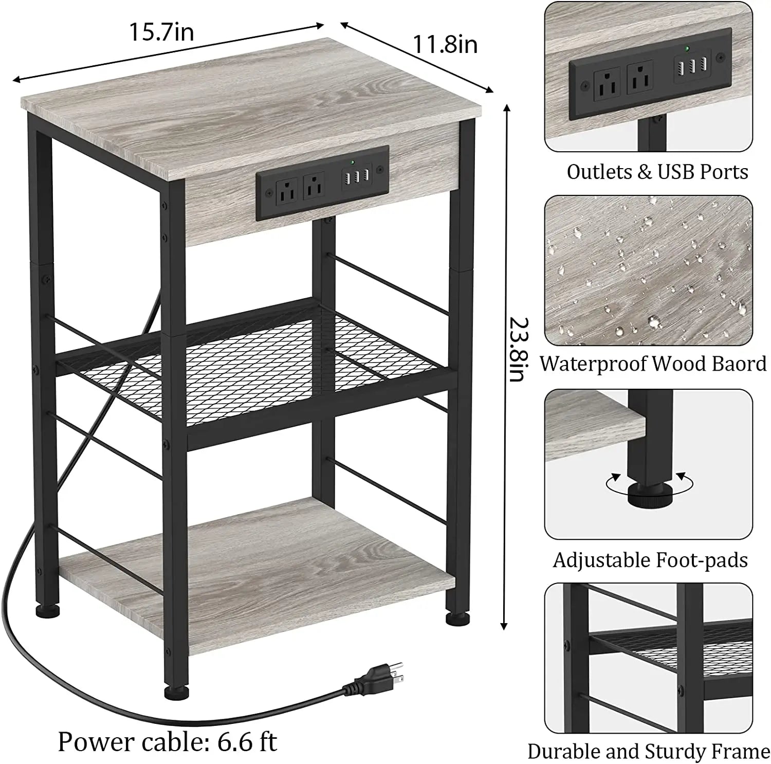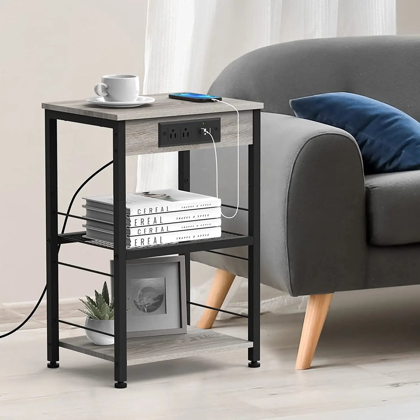 Three Layer Large Capacity - 15.7" W x 11.8" D x 23.8" H, this square side table features 3 tier storage shelves. Bedside table with charging station adds more storage space for your home, these modern side end tables are ideal for setting down lamps and books or displaying articles and houseplants.
