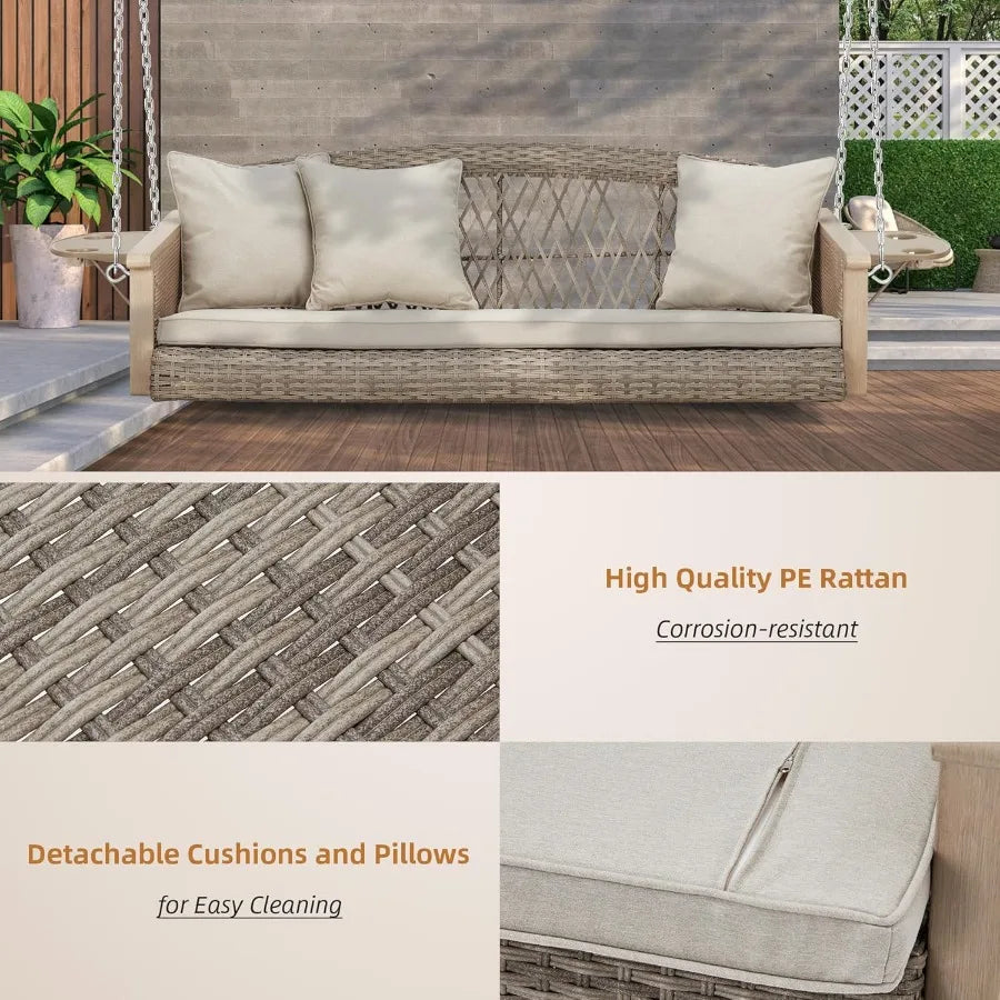 3Person Wicker Porch Swing with Upgraded Cup Holder 55 Inch Patio Hanging Swing Bench Chair with Cushions 900lbs Capacity Chain