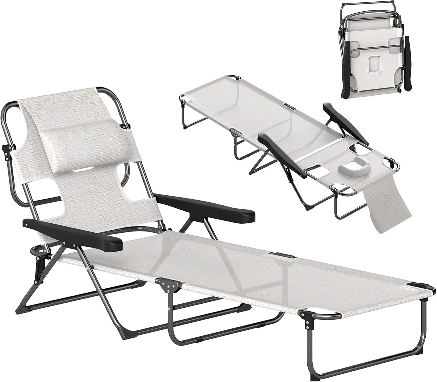 4-Position Beach Chair with Face & Arm Holes, Pillow headrest, Adjustable Sunbathing Chair, Gray