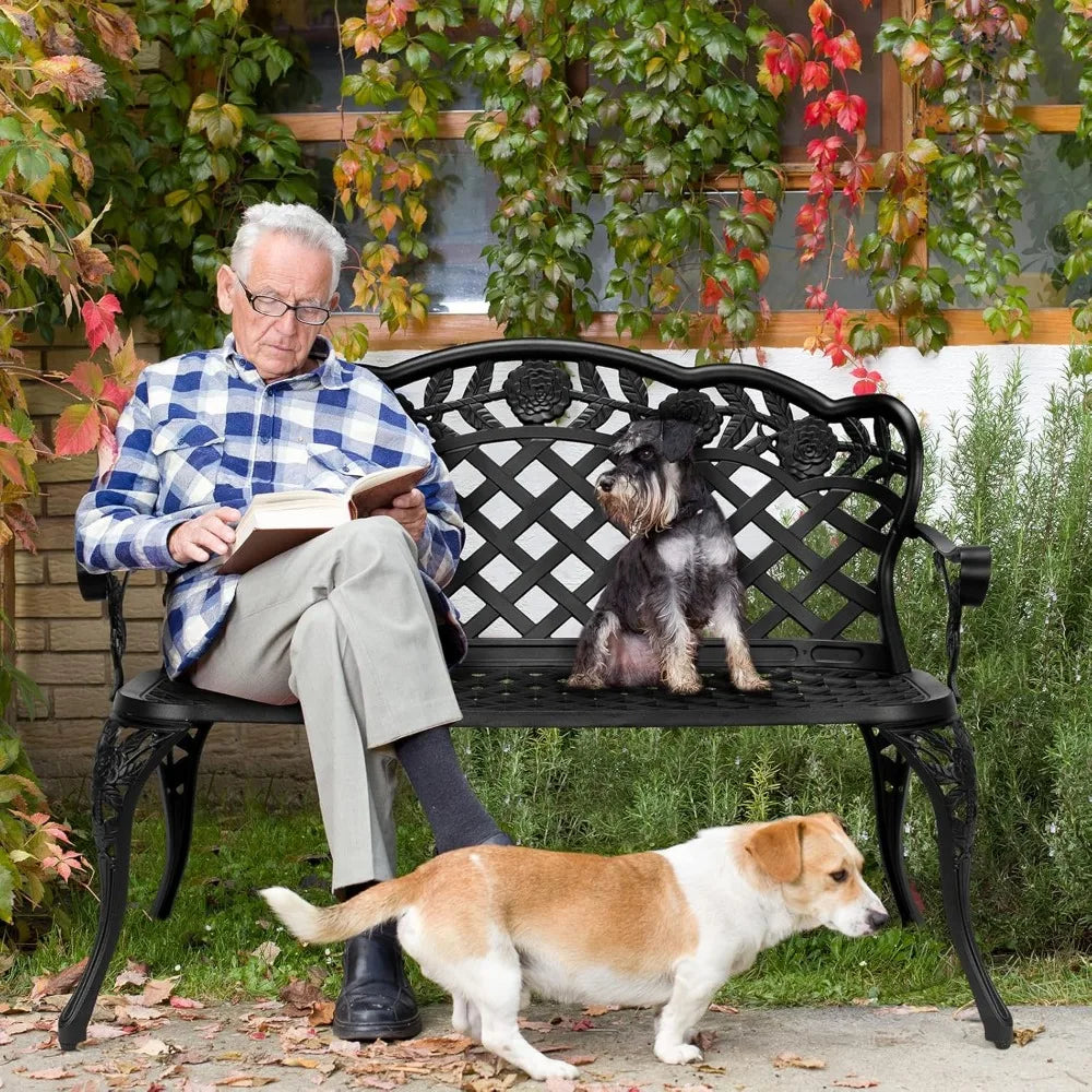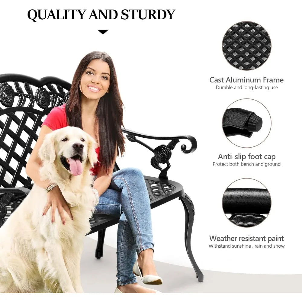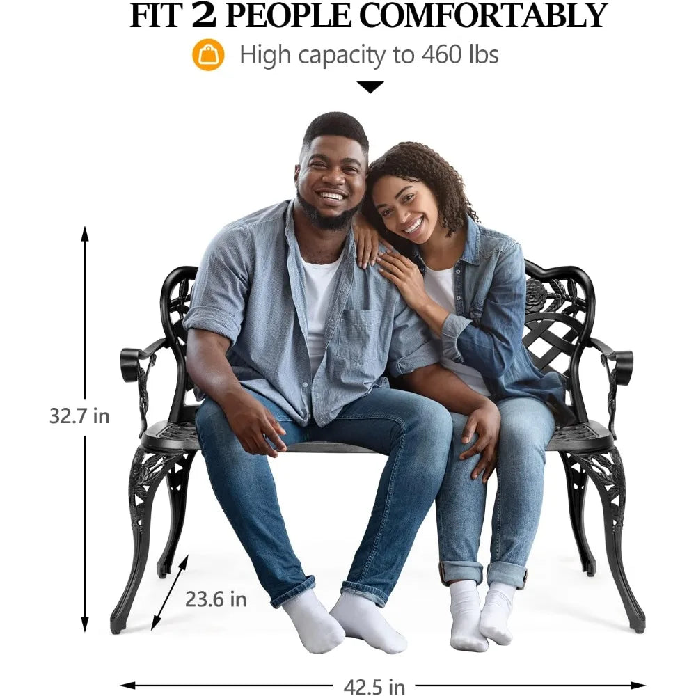 42.5" Outdoor Bench, Antique Cast Aluminum Front Porch Bench Metal Garden Benches Cast Iron Benches 2-3 People Seating (Black)