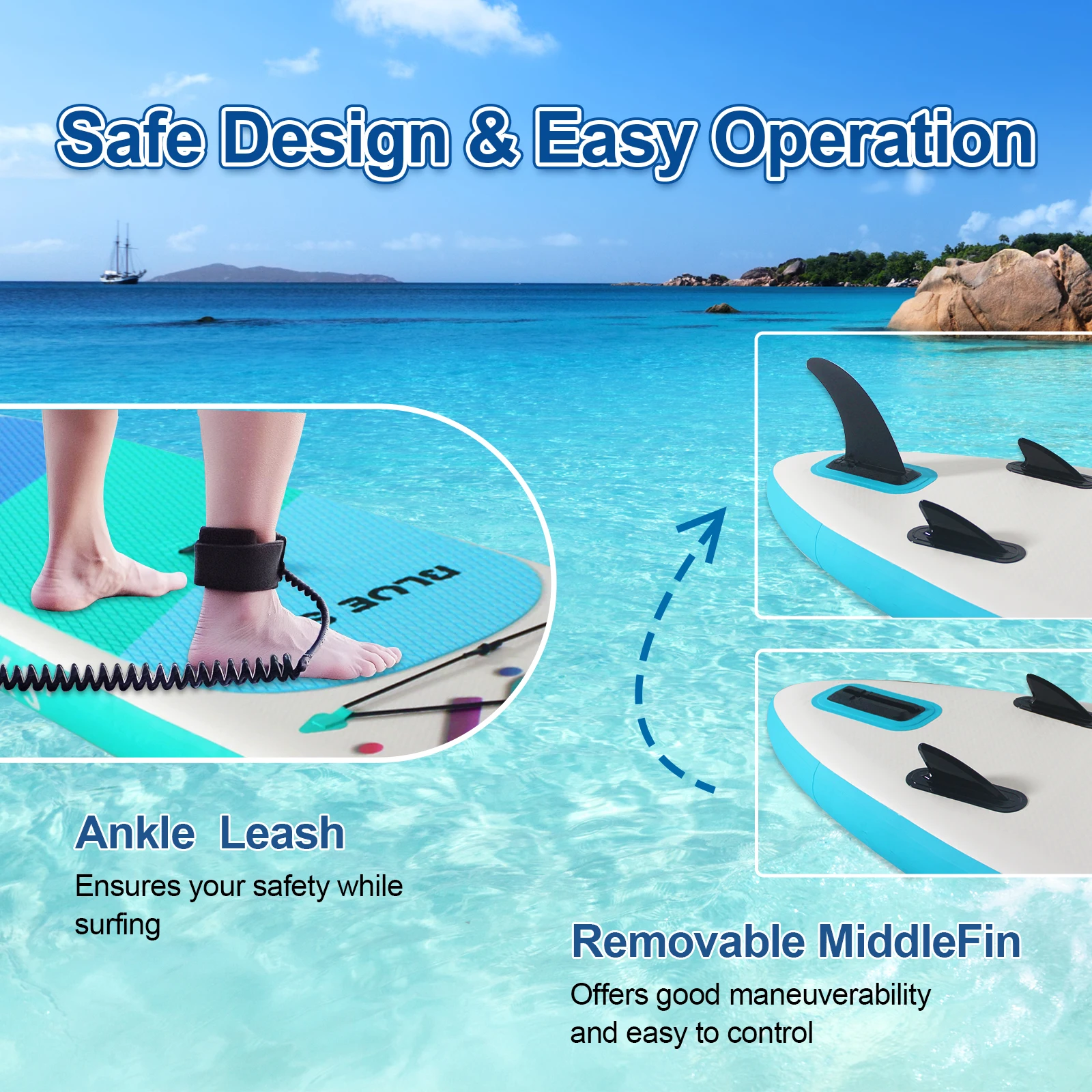This inflatable SUP (9'99''×30"×5") inflates in <5 mins with included pump.At 23.81 lbs, its double-layer PVC & drop-stitch core withstands 12-15 PSI for rigidity.Impact-resistant base protects against debris.It includes: