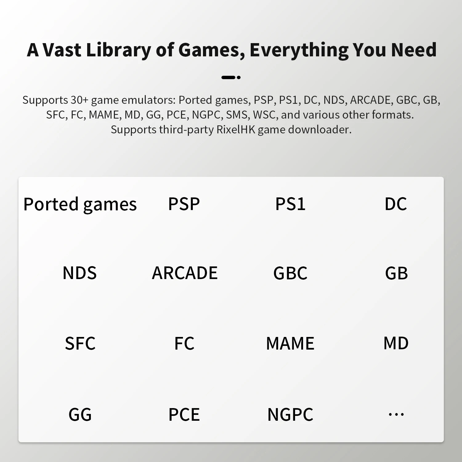 Extensive Game Compatibility:Supports a wide range of retro game formats, support users to download related format games.supports third-party software, RixelHK (Game Downloader).