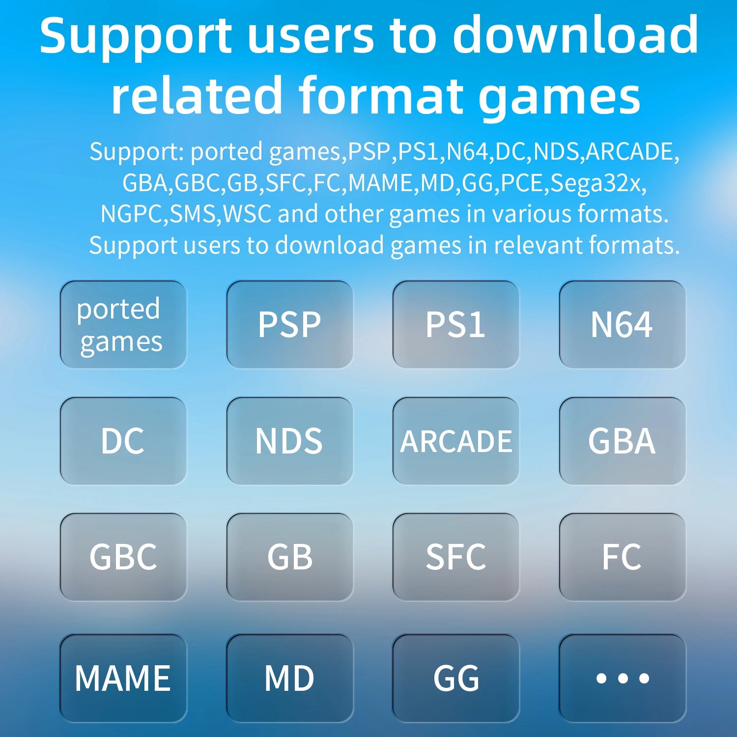 ● Games: Supports: ported games, PSP, PS1, N64,DC, NDS,ARCADE, GBA, GBC, GB, SFC, FC, MAME, MD, GG, PCE, PCE-CD, NGPC, sega32x, SMS, WSC, and various other game formats. Supports users to download games in related formats themselves.