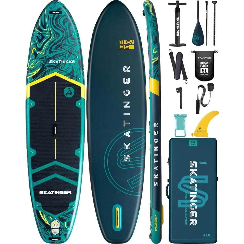 【35‘’ SUPER WIDE & ULTRA STABLE】Skatinger 11'6" paddleboard features a 35" wide platform(compared to typical 32" boards), making it ideal for beginners, families, and activities like yoga or simply relaxing. It also offers ample space for a child or pet to join the fun without compromising balance.