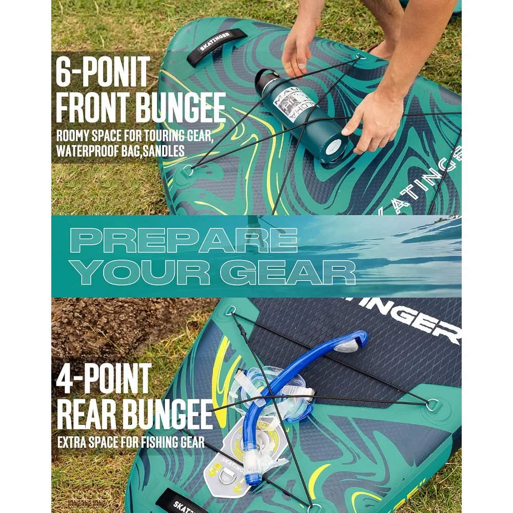 【CARGO STORAGE WITH DUAL BUNGEE SYSTEM】Skatinger SUP board features a dual bungee system: a 6-point bungee at the front and a 4-point bungee at the rear, providing ample space for gear like dry bags, jackets, coolers, or fishing equipment. This system is ideal for keeping everything secure and easily accessible during fishing, long-distance paddling, or day trips.