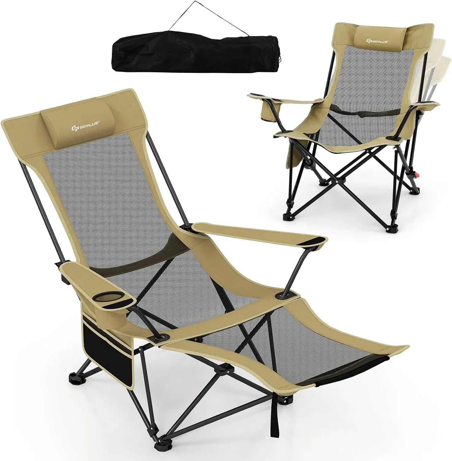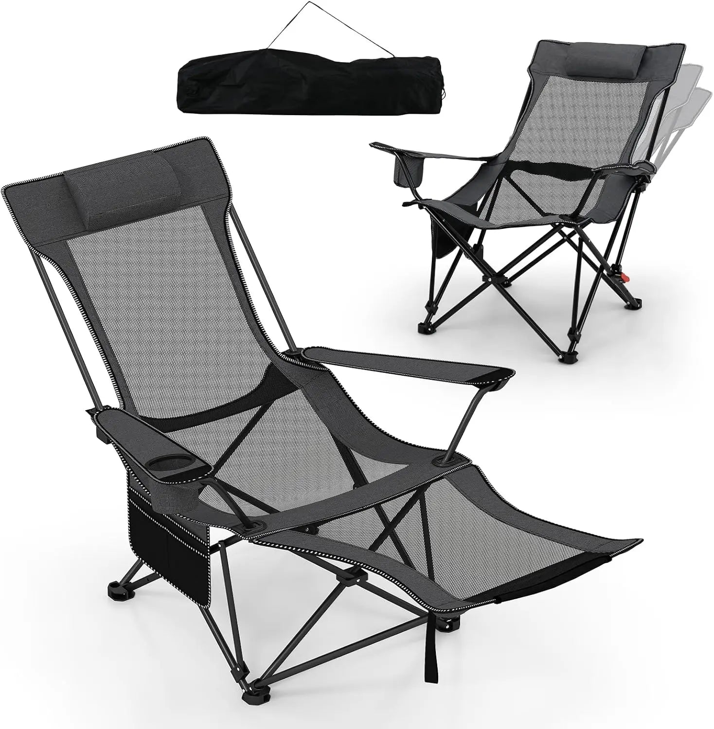 Camping Lounge Chair w/Detachable Footrest, Folding Beach Chair w/4-position Backrest, Carrying Bag, Removable Pillow,Cup Holder