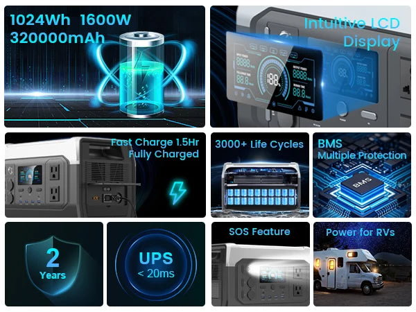 CTOLITY XP1000 1800W 1024Wh Portable Power Station, Lifepo4 Battery+200W 20.5V Foldable Solar Panel Power outage, Emergency,RV