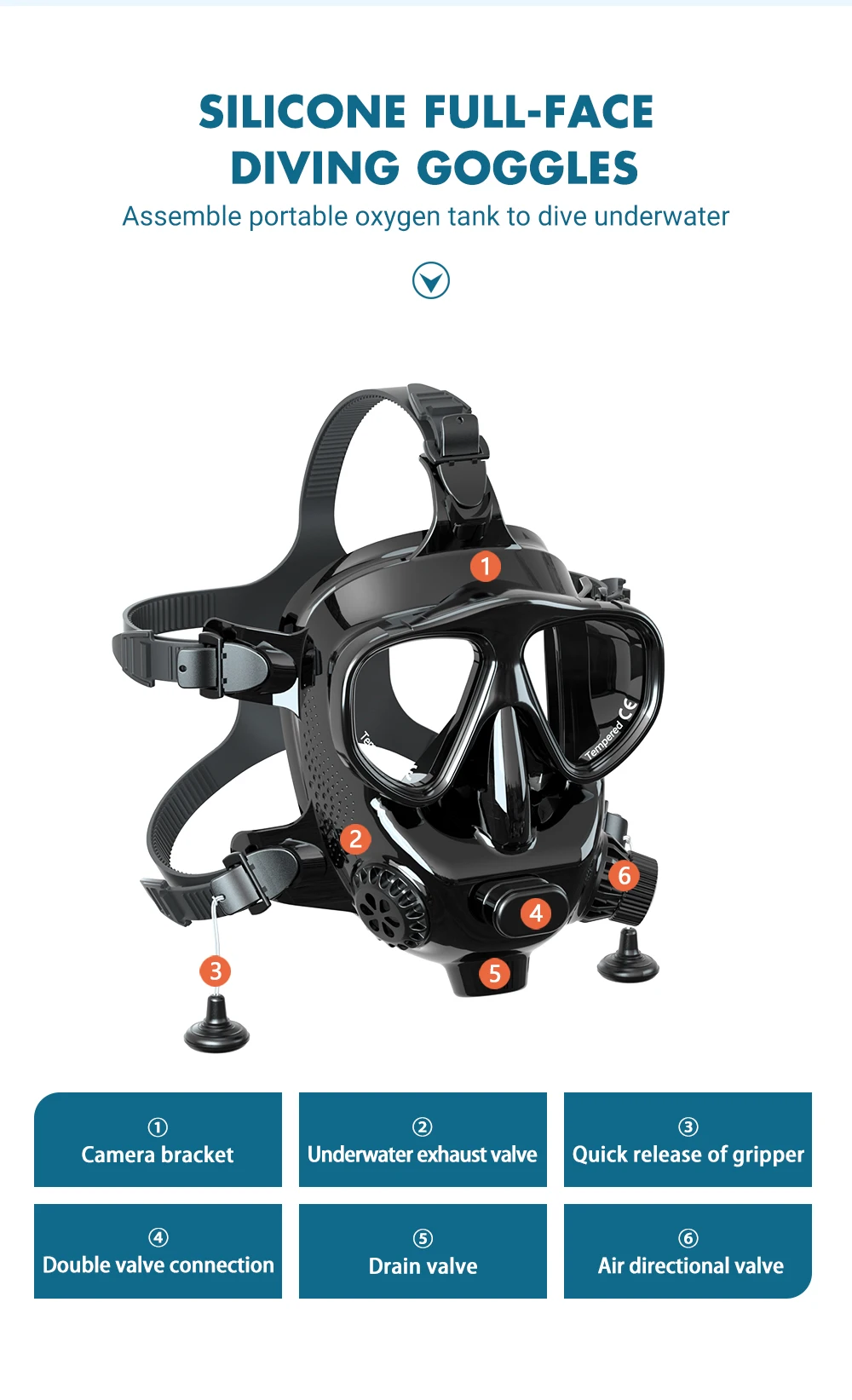 🤿【More Comprehensive Diving Mask】: This full-face mask can provide a 180° panoramic view for you to see the underwater world more clearly. It has a detachable camera mount for you to capture every moment underwater. The dual-channel exhaust design of the secondary valve and the exhaust valve perfectly solves the foggings. Moreover, the diving mask has a drain valve, if there comes a leak underwater, just pull the drain valve, the compressed air in the mask will drain the water.