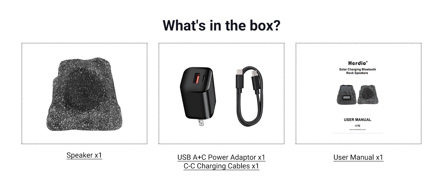 Included Components: 1M Fast Charging Cable * 1, 1 * instruction manual, USB A+C Power Adaptor x1, 1 * Main rock speakers