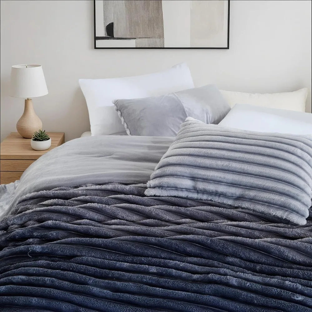 King Size Grey Ombre Fluffy Ribbed Comforter Set with Plush Fleece Bedding and Warm Fuzzy Mattress