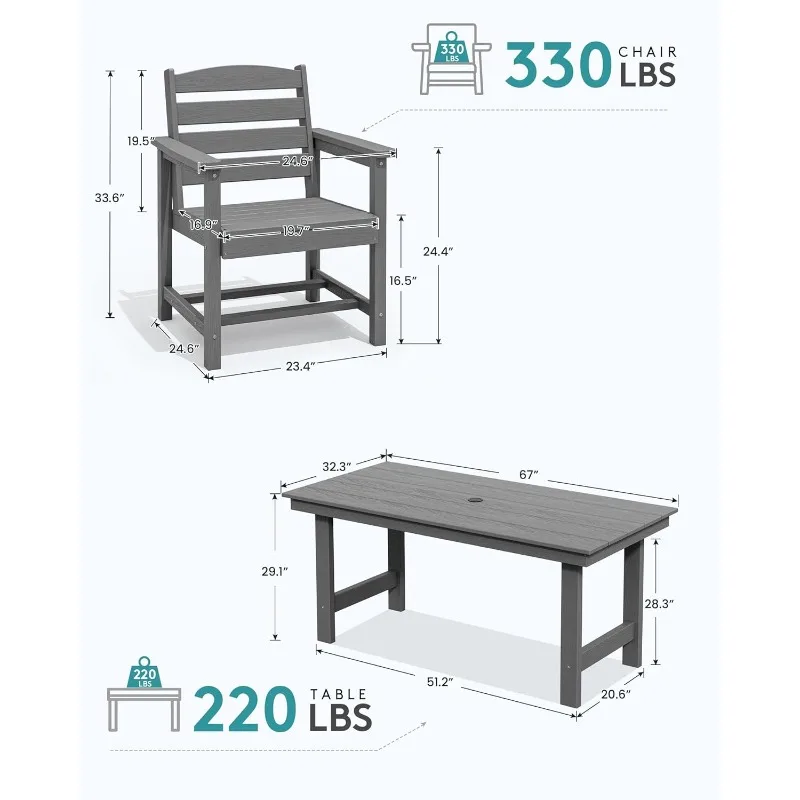 【Low Maintenance】HDPE dining table sets required low maintenance. Unlike the Steel dining sets may require rust prevention, SERWALL patio dining table and chairs are easy to clean with just soap and water, requiring minimal effort to keep them looking fresh.