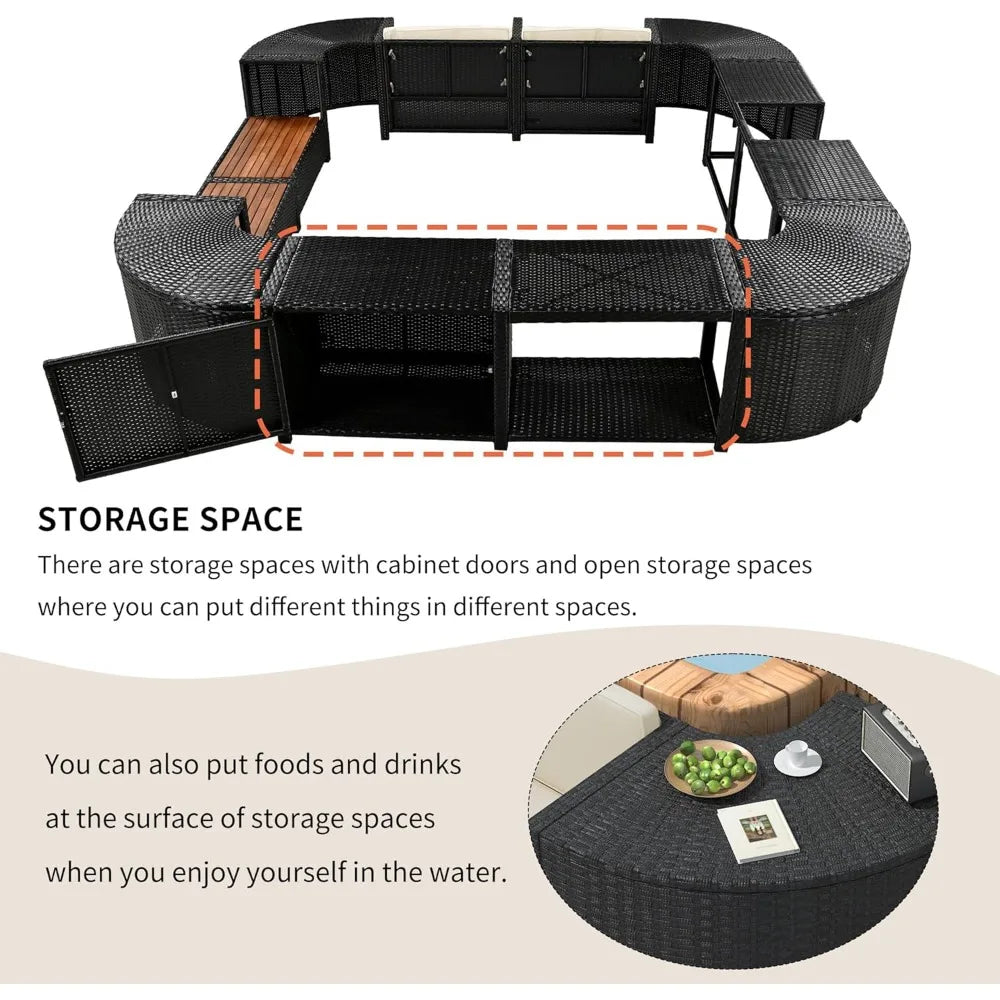 - [User-friendly Design] The hot tub has a built-in storage area around it for easy organization and easy access to spa essentials.