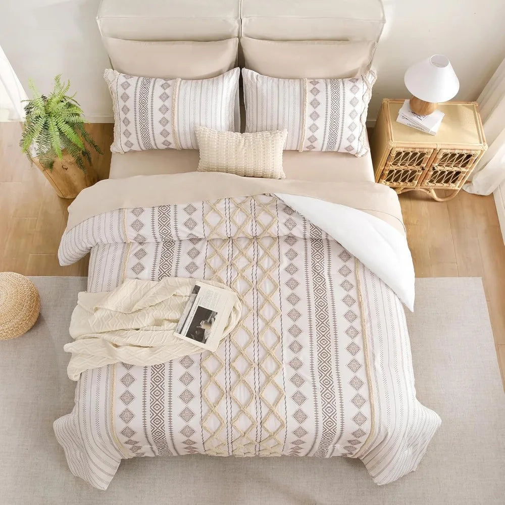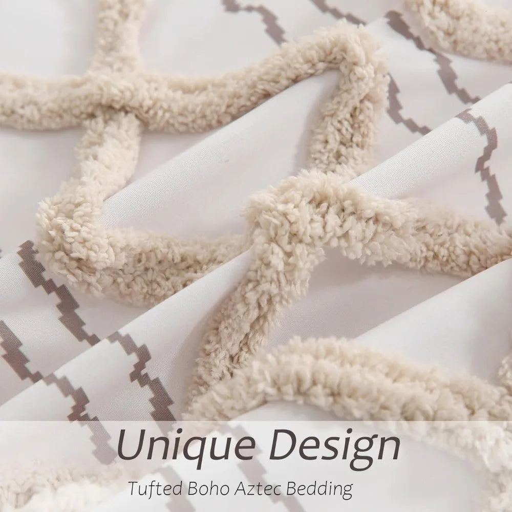 Queen Size Shabby Chic Aztec Western Beige Tufted Boho Comforter Set with Bedding