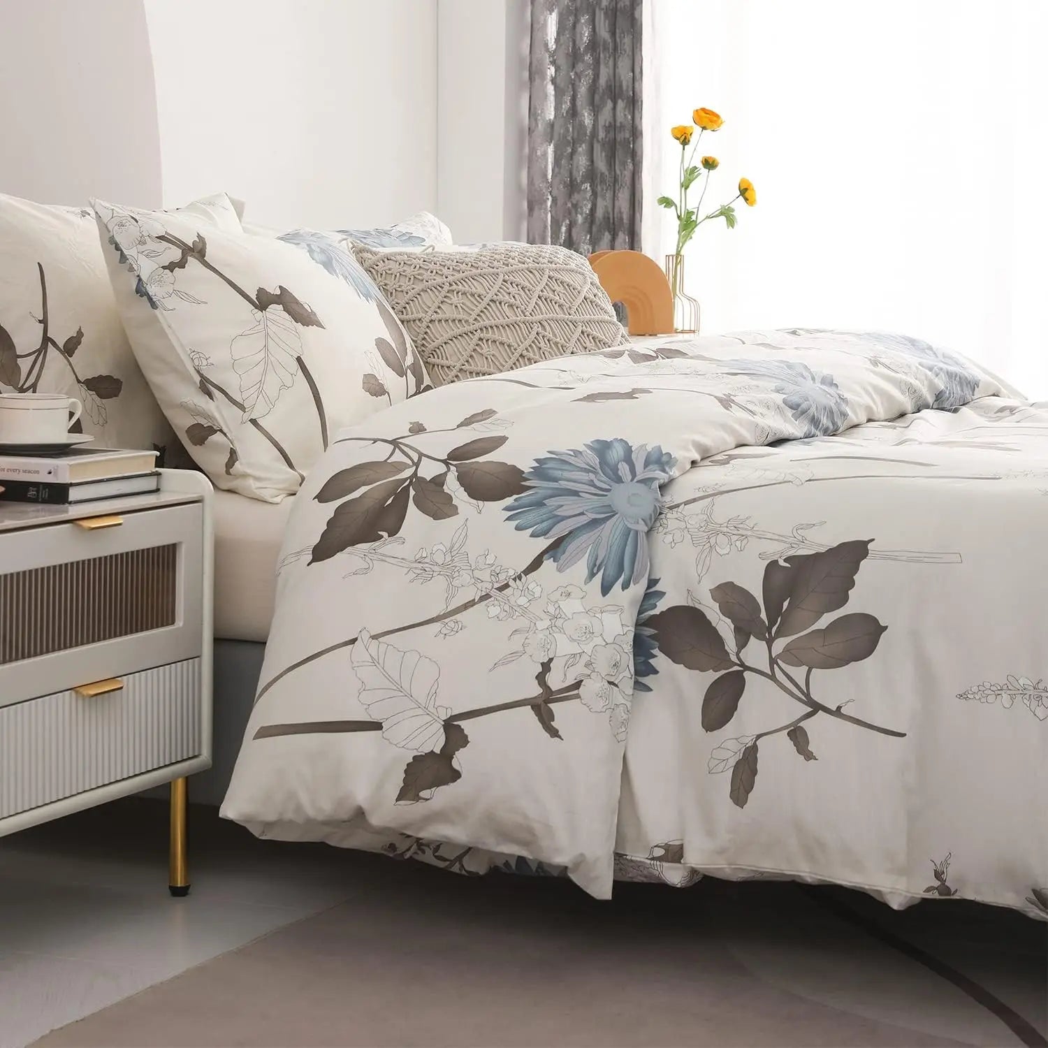 SLEEPBELLA Comforter 600 Thread Count Cotton Brown Branches and Blue Flowers Off-White Comforter Down Alternative Bedding Sets