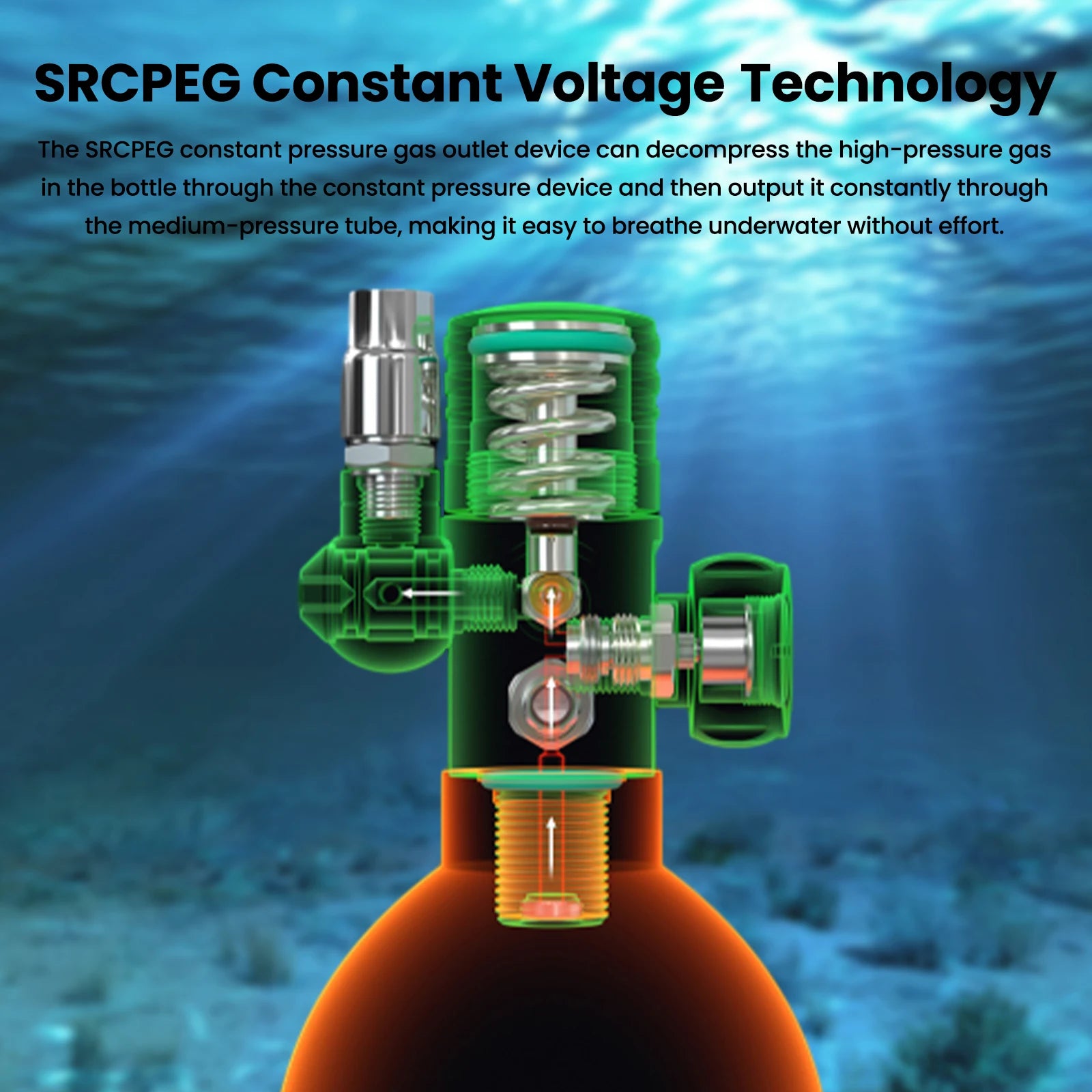 【Constant Pressure Air Outlet Device】SRCPEG constant pressure air outlet device can decompress the high-pressure gas in the bottle through the constant pressure device and then output it constantly through the medium-pressure tube, ensuring easy and effortless breathing underwater. The 360° rotatable joint is combined with a pressure-resistant medium-pressure tube to easily achieve 360° free rotation underwater and adapt to any posture underwater.
