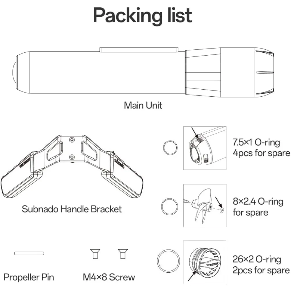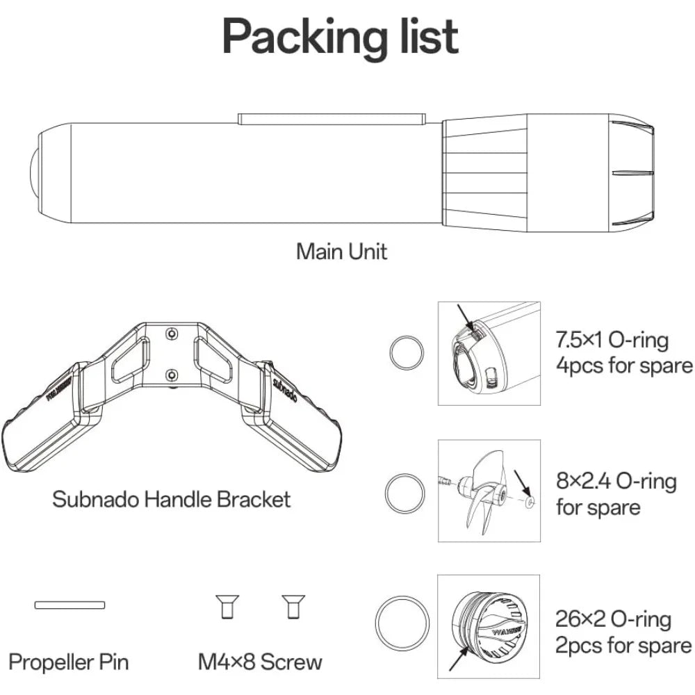 Subnado Lite Includes: The Subnado Lite Set included Subnado Main Unit*1, Subnado Handle Bracket*1, Propeller Pin, Screws and several different sizes of O-rings for spare. Streamlining optional accessories, more convenient to carry.