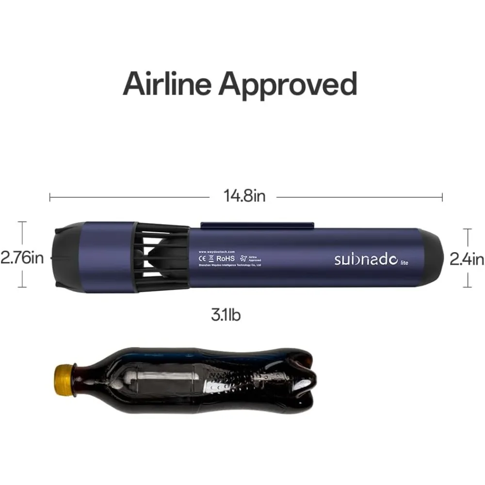 Compact & Portable: 14.84*2.75*2.75in and weighing only 3lbs, the Subnado underwater scooter is about the size of a small soda bottle. Your Subnado goes where you go, conveniently in your carry-on luggage, with an airline-approved 98Wh battery to add more fun to your underwater journey. (Check airline and airport rules before flying because different airlines and airports may have different regulations.)